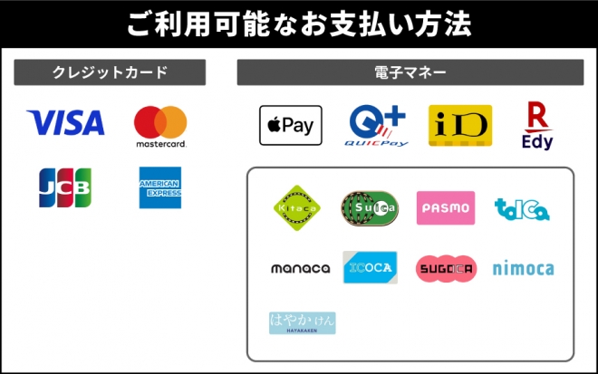 アップルペイ・クイックペイ・iD・交通系IC・楽天Edyもお使いいただけます!